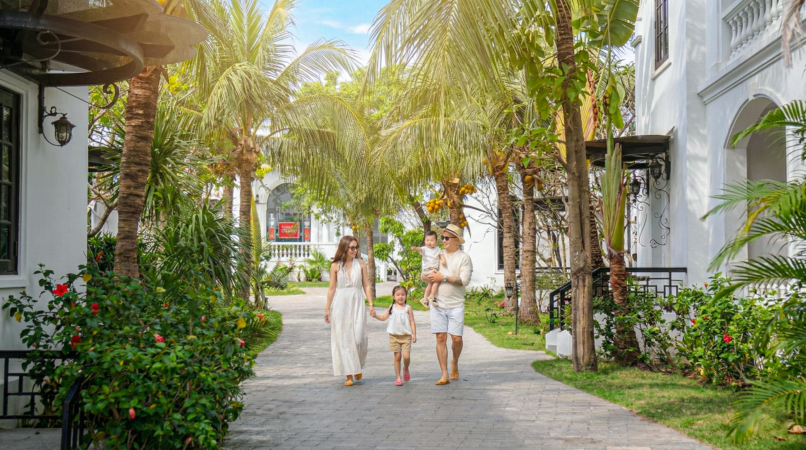 Bước chân vào Seaside Boutique Resort, du khách như lạc vào một ngôi làng Châu Âu thu nhỏ. Những căn villa với tông màu trắng chủ đạo, thiết kế mái vòm bán cổ điển trang nhã nổi bật trên nền xanh của rừng dừa và màu ngọc bích của biển cả. Mỗi góc nhỏ tại đây – từ lối đi lát đá rợp bóng cây đến những ban công ngập nắng – đều là một studio ngoài trời hoàn hảo để lưu giữ những khoảnh khắc hạnh phúc của gia đình.